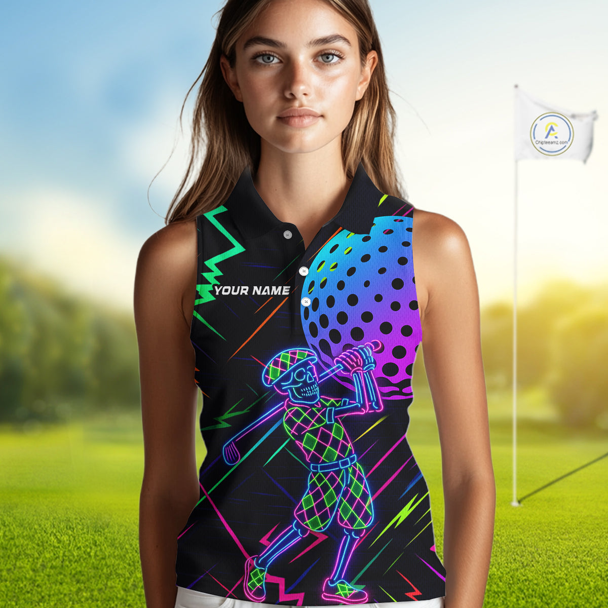 Colorful Neon skull golfer Women Sleeveless polo shirt custom golf attire for ladies, cool golf gifts NQS10098