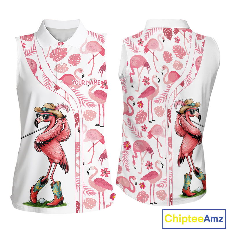 Funny White and Pink Flamingo sleeveless golf polo shirts Custom team Flamingo golf outfit ladies NQS11546