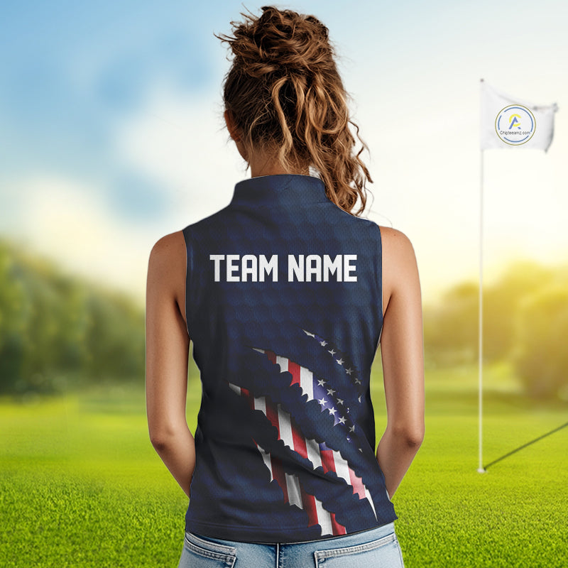 Personalized American Flag Women sleeveless polo shirt Patriotic Ladies Golf Team Shirt | Navy Blue NQS10179