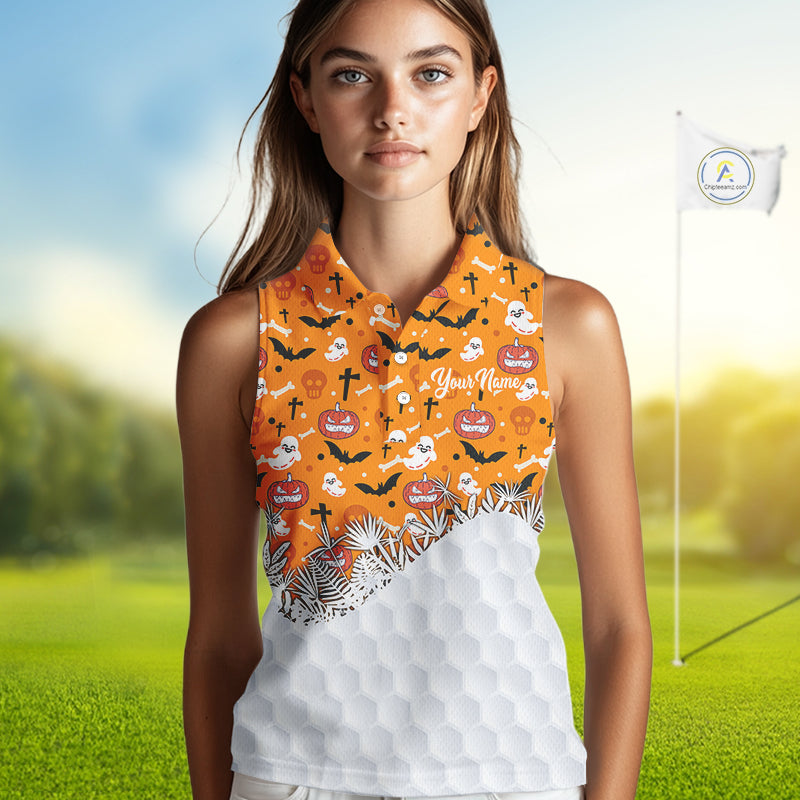 Personalized funny orange Halloween pattern Women sleeveless golf polo shirts best ladies golf wears NQS10314