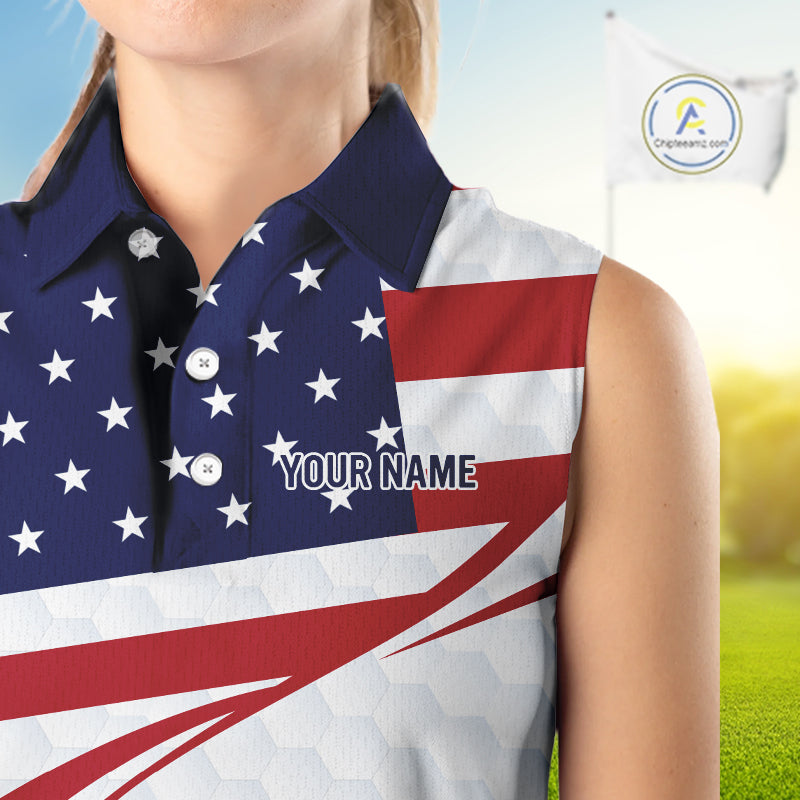 Red, White and Blue American Flag Sleeveless Polo shirt for Women custom patriotic ladies golf attire NQS10304