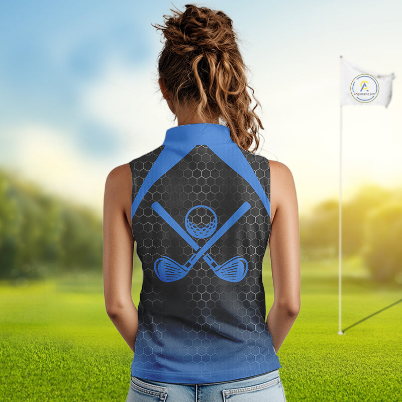 Women sleeveless polo shirt custom black and blue hexagon pattern golf outfits ladies, cool golf gift NQS10317