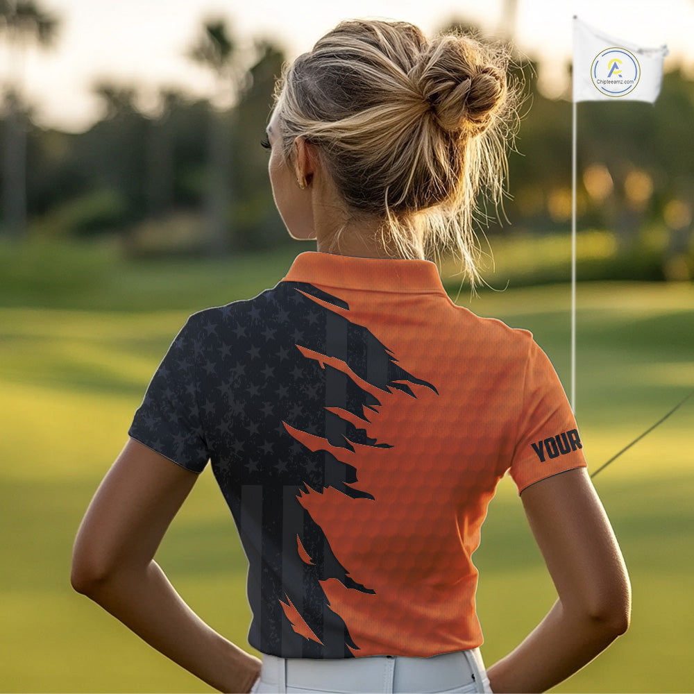 Personalized Women golf polo shirt custom orange golf ball black American flag ladies golf apparel NQS10070
