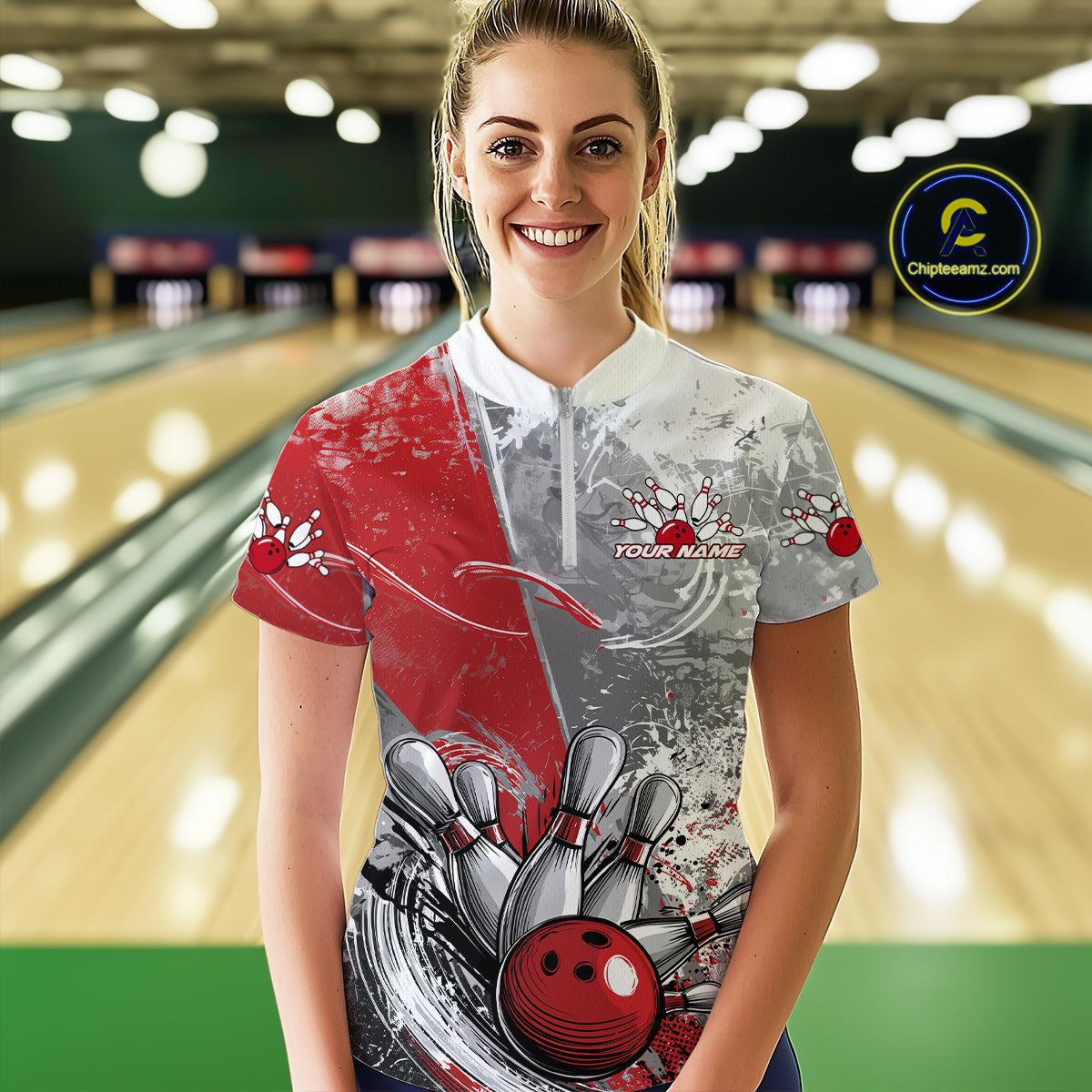 Custom Grunge Red Bowling Women Quarter-Zip Shirt, Distressed Vintage Bowling Team Shirts IPHW9550