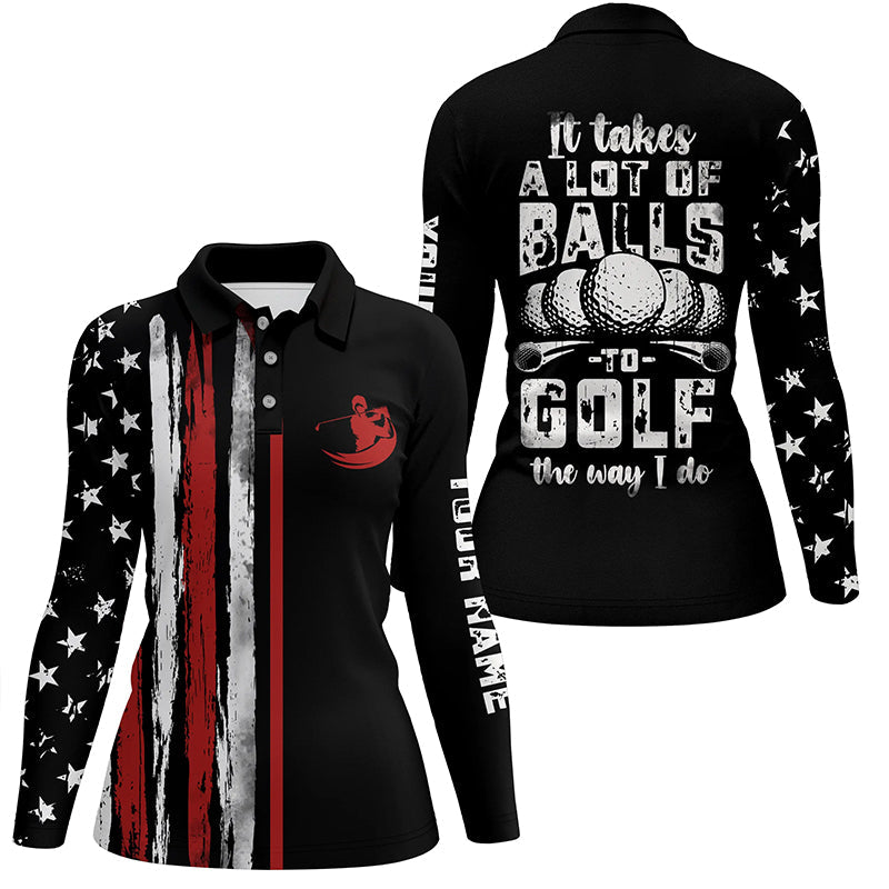 Vintage American flag black Womens golf polo shirt custom It takes a lot of balls to golf the way I do NQS6545