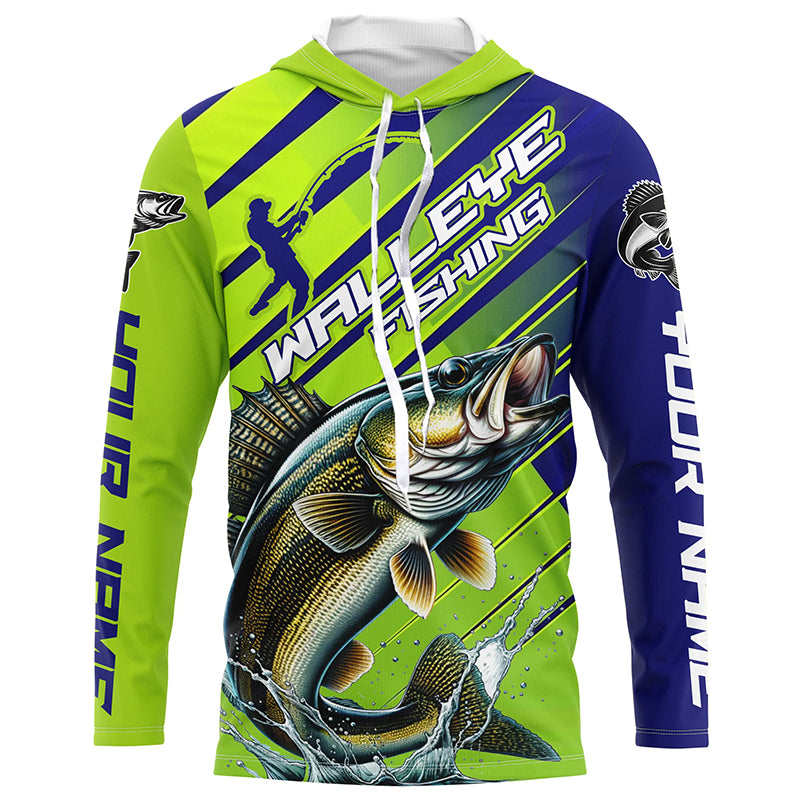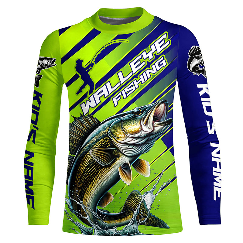 Walleye Fishing Custom Long Sleeve Tournament Shirts, Green And Blue Walleye Fishing Jerseys IPHW6279