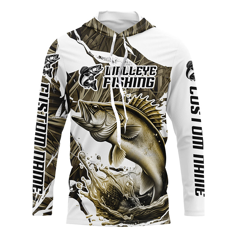 Grass Camo Custom Walleye Fishing Long Sleeve Tournament Fishing Shirts, Walleye Fishing Apparel IPHW6461