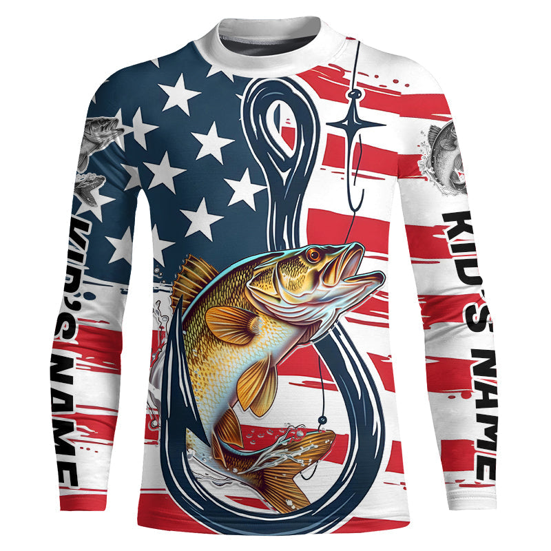 Us Flag Fish Hook Custom Patriotic Walleye Long Sleeve Fishing Shirts, Walleye Fishing Jerseys IPHW7957