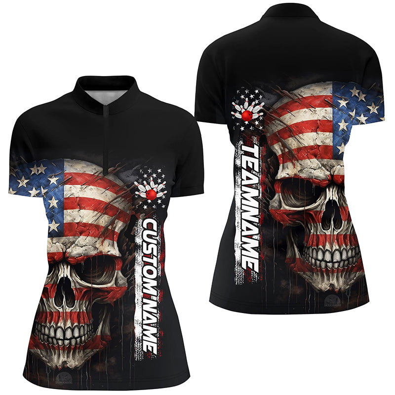 Personalized Skull Bowling Shirt For Women Custom American Flag Bowler Jersey IPHW5158