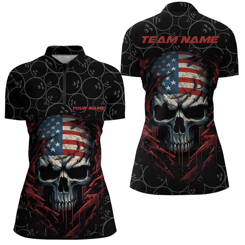 Custom American Flag Skull Bowling Shirts For Women, Patriotic Team Bowling Jerseys IPHW5160