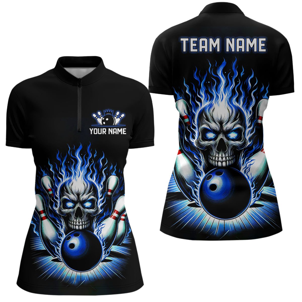 Personalized Skull Bowling Shirt For Women Custom Team'S Name Flame Bowler Jerseys | Blue IPHW6012