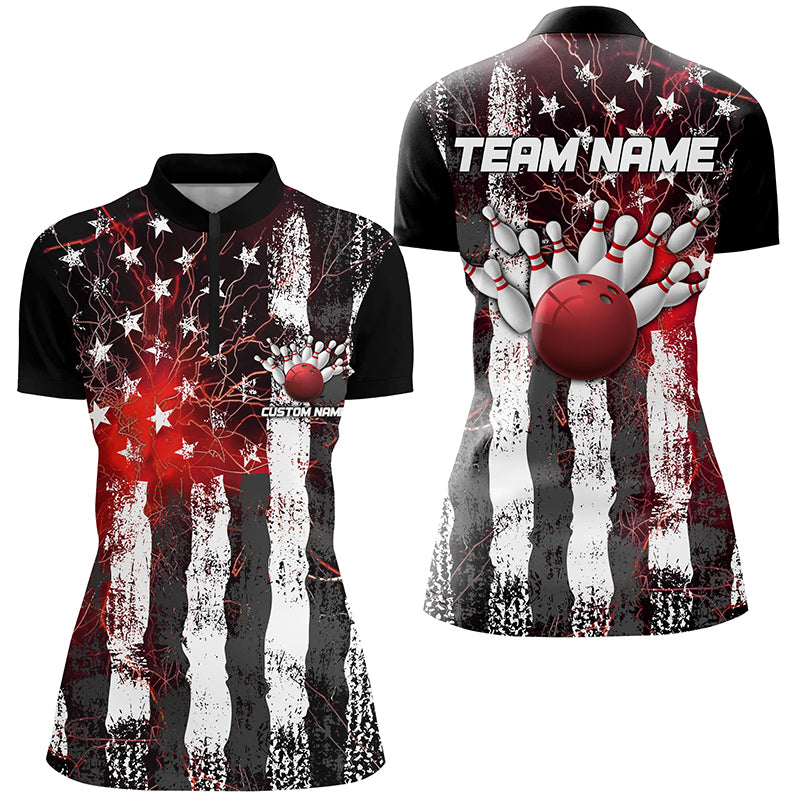 Red Lightning American Flag Custom Ladies Bowling Team Jerseys, Patriotic Bowling Shirts IPHW6178
