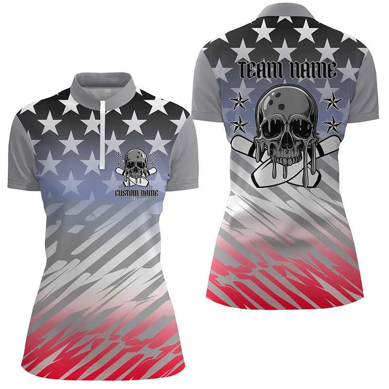 Custom American Flag Skull Bowling Shirts For Women, Patriotic Team Bowling Jerseys IPHW6193