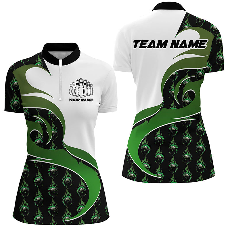 Customized Green Flame Bowling Polo Shirts For Women, Bowling Team Shirts Outfit Bowling IPHW6973
