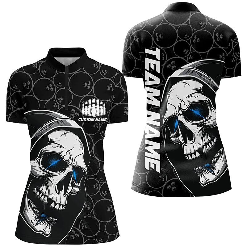 Custom Halloween Skull Bowling Shirts For Women, Personalized Bowling League Shirts | Blue IPHW7078