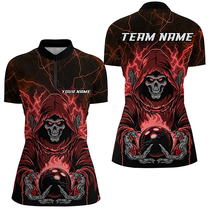 Black And Red Lightning Custom Skull Bowling Shirts For Women, Halloween Bowling Shirts IPHW7090