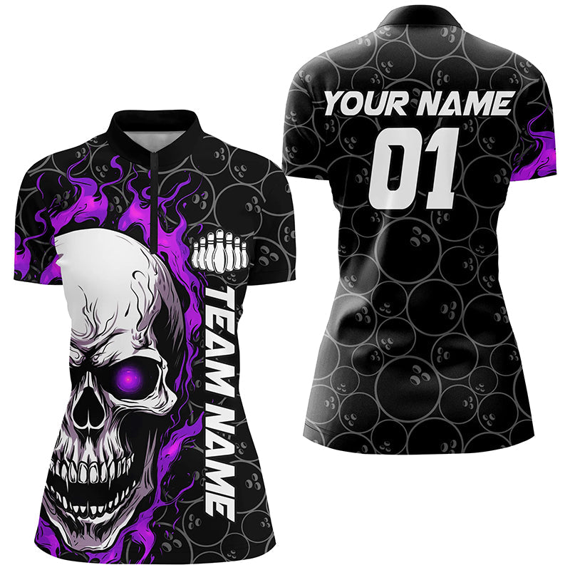 Custom Purple Flame Skull Halloween Ladies Bowling Shirt With Custom Name, Team Name, Number IPHW7104