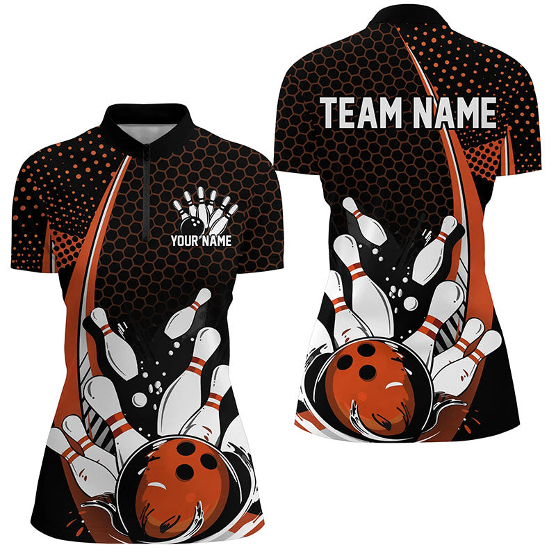 ✔️ Custom Women's Bowling Shirts Our uniquely designed bowling polo and quarter-zip shirts are ideal for proud female bowlers who want to make a bold statement. With a stylish form and distinctive design, these shirts set you apart from the rest, highlighting your passion and confidence in bowling. Add your personal touch to create a one-of-a-kind shirt that carries your unique imprint.