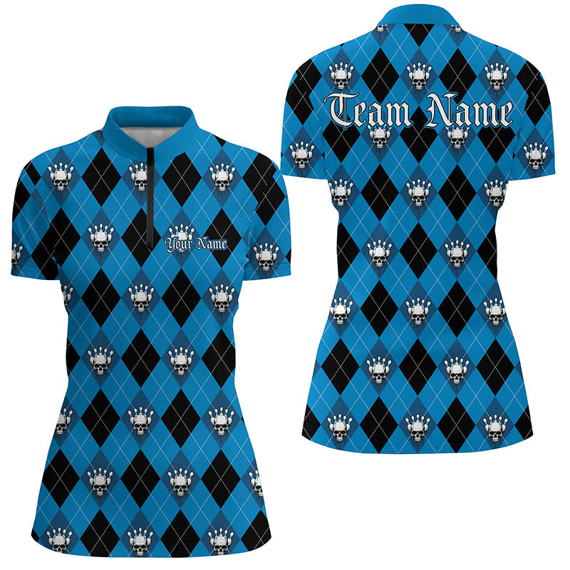 Black And Blue Argyle Pattern Custom Skull Ladies Bowling Shirts, Halloween Outfit Bowling IPHW7298