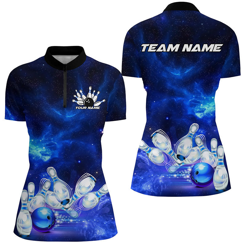 Custom Blue Galaxy Bowling Shirts For Women, Bowling Team Shirts Bowlers Outfits IPHW7546