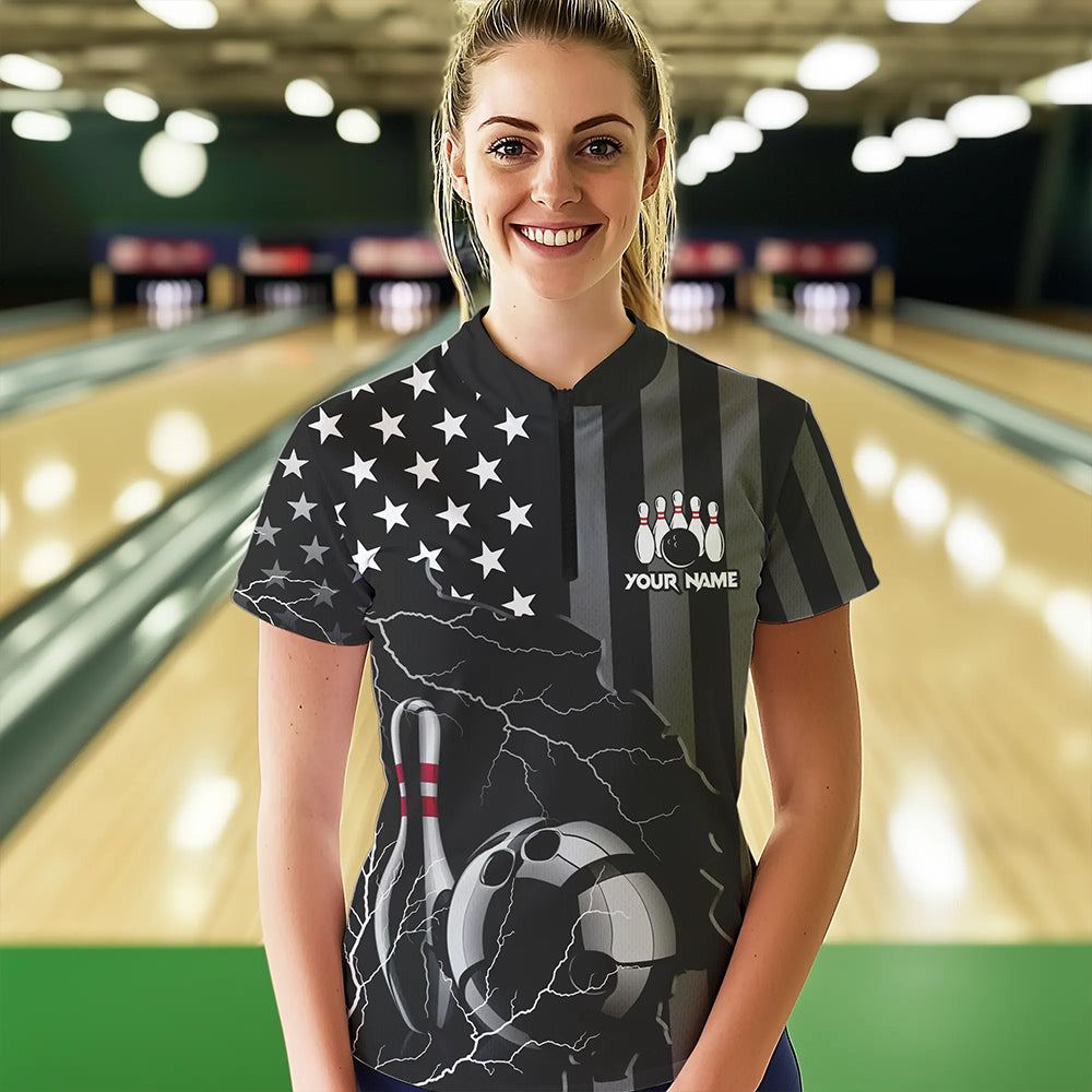 Personalized Black American flag Lightning thunder Custom Bowling Team Shirts For Women Bowling Jersey NQS9538