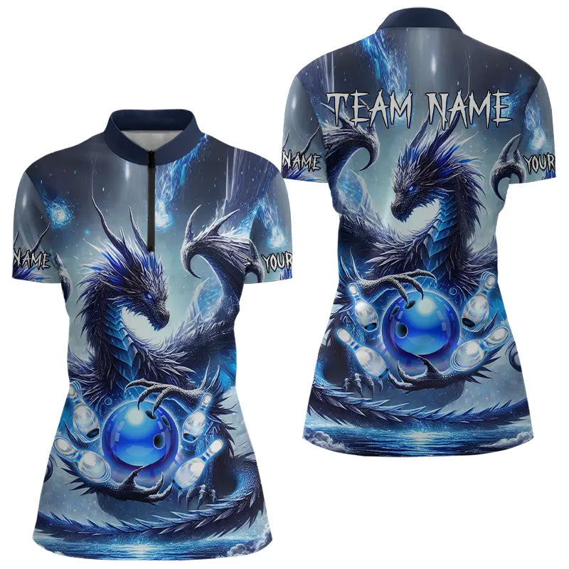 Personalized Blue Lights Dragon Women Bowling Polo, Quarter Zip Shirts Custom Team Bowling Jerseys NQS9234