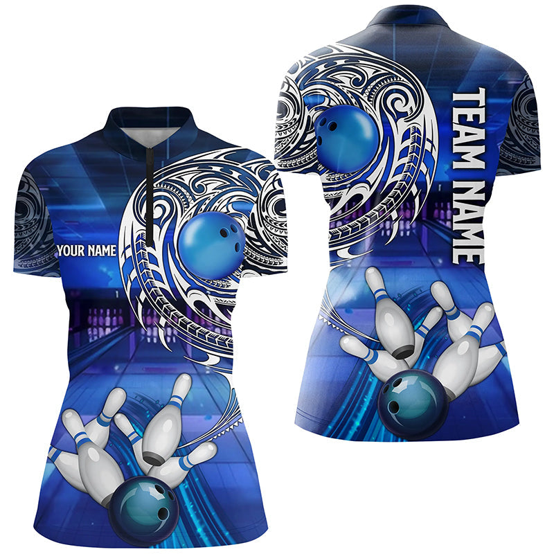 Personalized Blue tribal pattern custom bowling Polo, 1/4 zip shirts for Women, cool bowling jerseys NQS8339