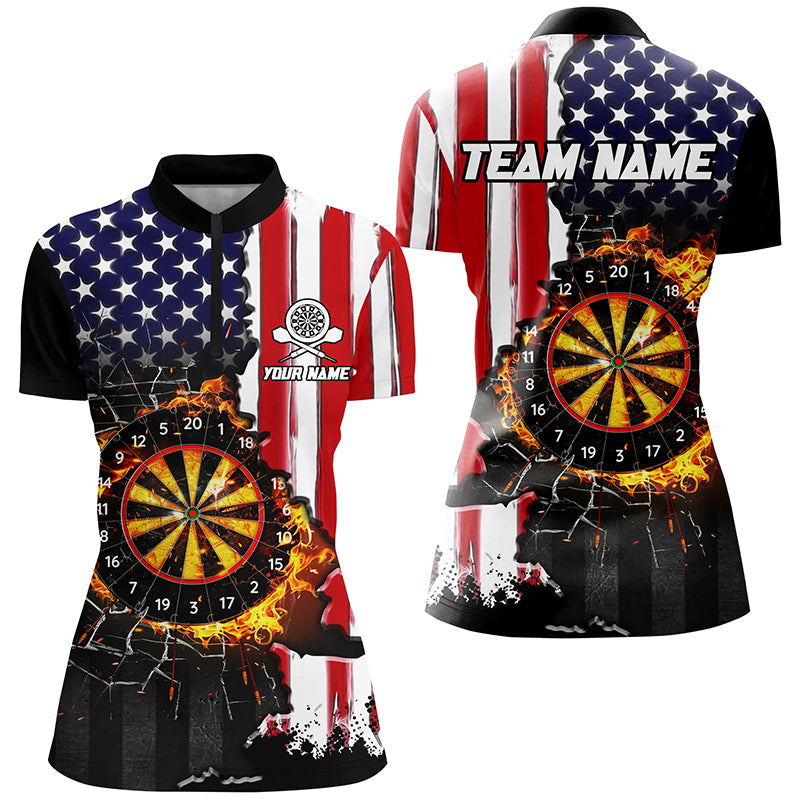 American Flag Darts Board Fire Flame Break Glass Custom Women Darts Shirts, Patriotic Darts Jerseys TDM1830