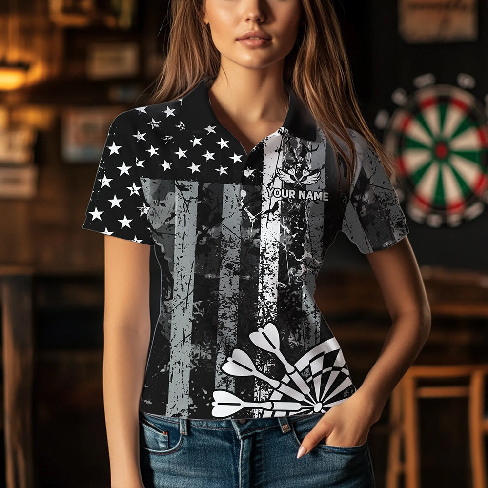 Custom Black Grunge US Flag Patriotic Darts Shirt For Women, Retro Darts Board Darts Team Jerseys TDM2273