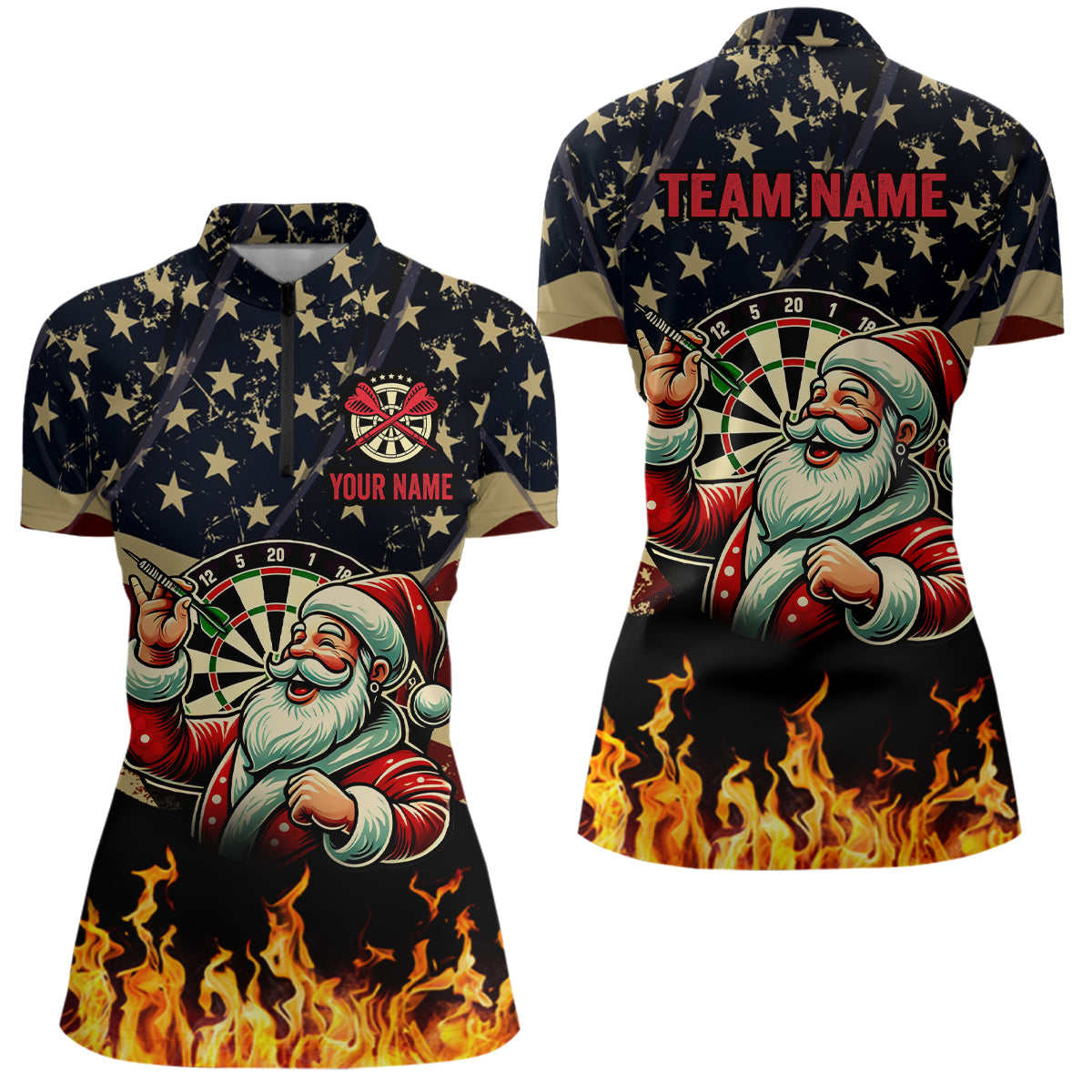 Funny Christmas Santa Playing Darts Custom USA Flag Fire Women Dart Shirts, Patriotic Dart Jerseys TDM2848