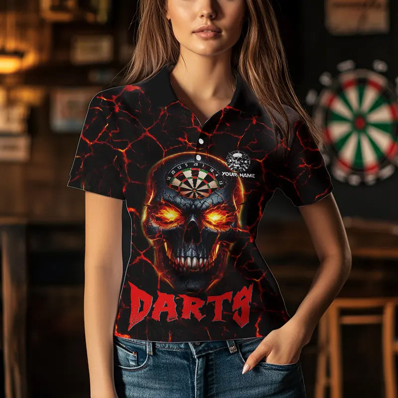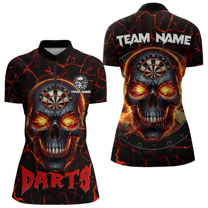 Personalized Red Dartboard Skull Fire Crack Dart Shirts Polo & 1/4 Zip For Women Custom Dart Jerseys TDM3641