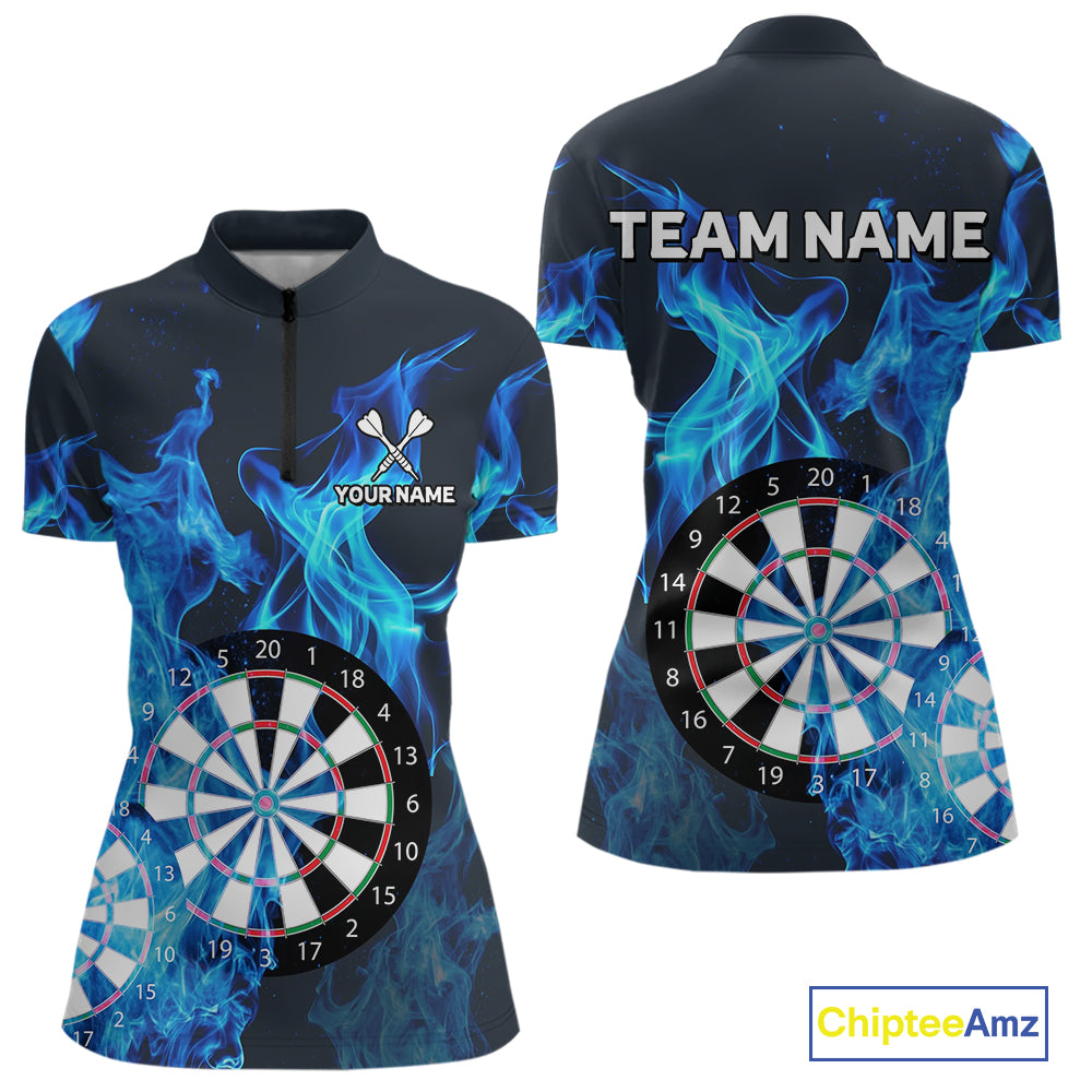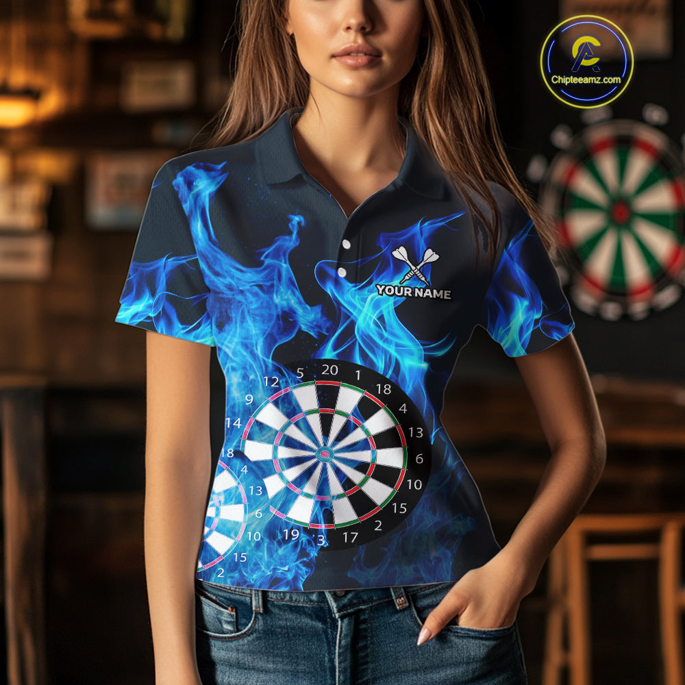 Blue Flaming Dartboard Darts Polo & Quarter Zip Custom Dart Shirts For Women Team Dart Jerseys TDM3821