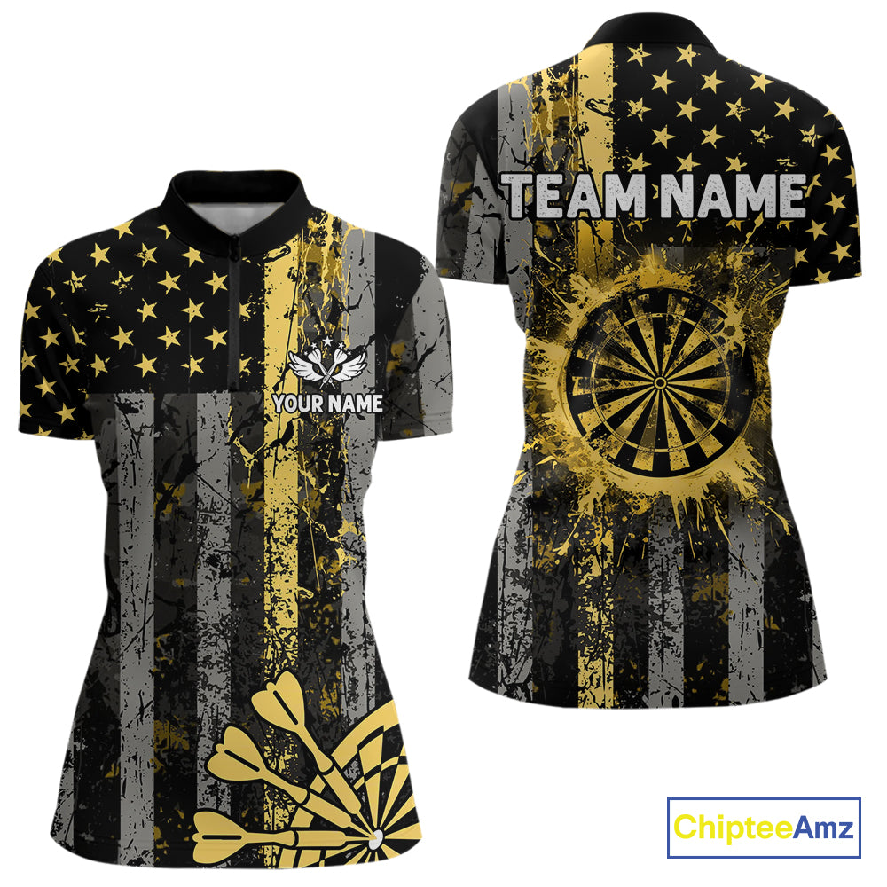 Custom Gold Grunge US Flag Patriotic Darts Shirt For Women, Retro Darts Board Darts Team Jerseys TDM3972