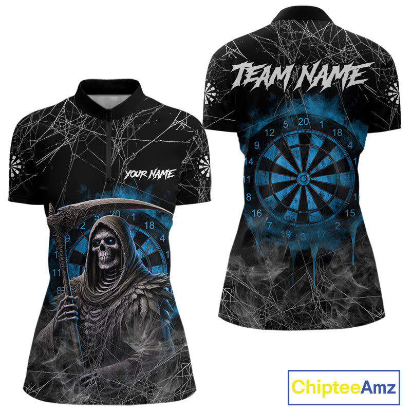 Black And Blue Grim Reaper Smoke Funny Dart Shirts For Women Custom Dart Jerseys, Darts Clothing TDM4005