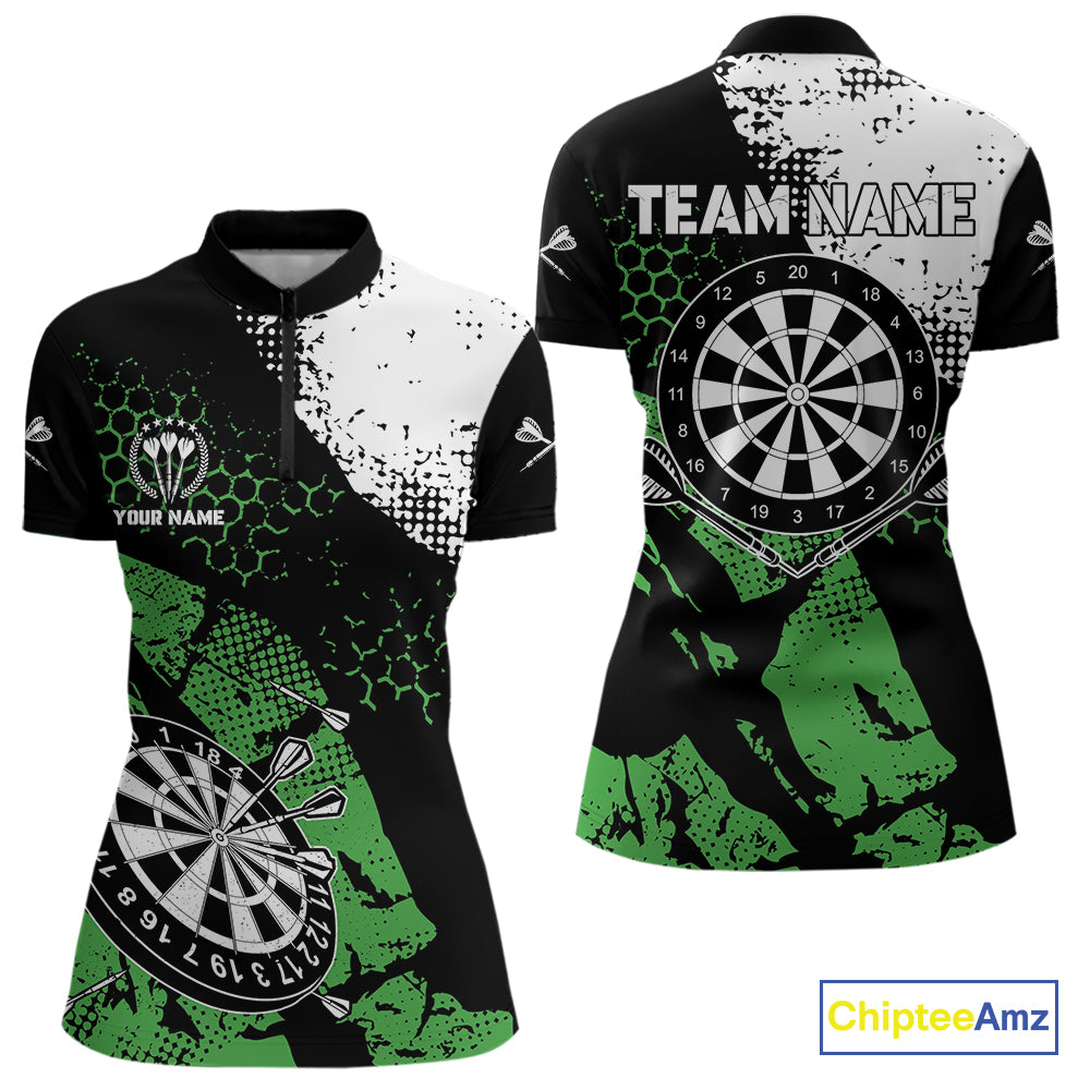Retro Black Green Grunge Pattern Darts Polo, Quarter Zip Custom Women Dart Shirt Team Dart Jersey TDM4039