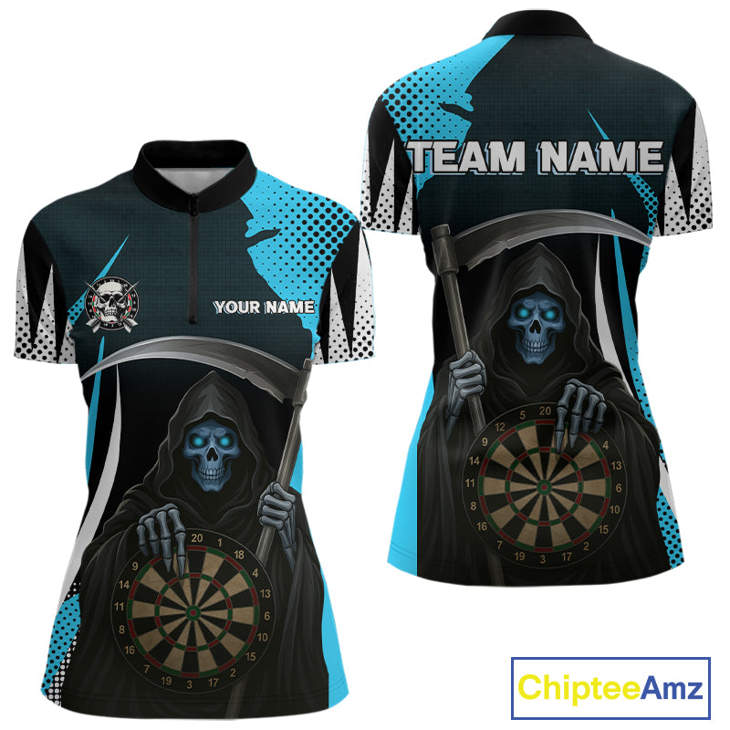 Personalized Blue Grim Reaper Dart Shirt For Women Custom Skull Dart Jerseys Team Polo & 1/4 Zip TDM4210