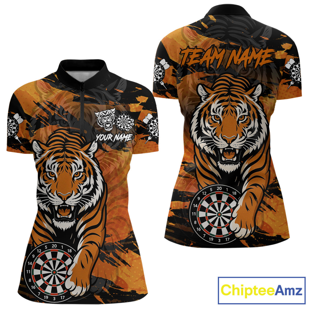 Personalized Black And Orange Tiger Darts Shirt For Women Custom Darts Jersey Team Polo & 1/4 Zip TDM4275