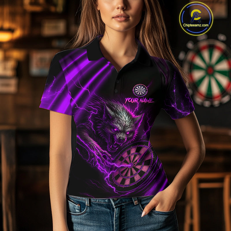 Personalized Purple Thunder Lightning Wolf Darts Shirt For Women, Darts Team Jersey Polo & 1/4 Zip TDM4384