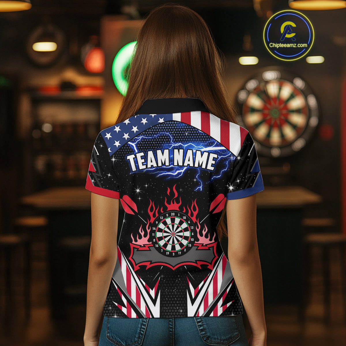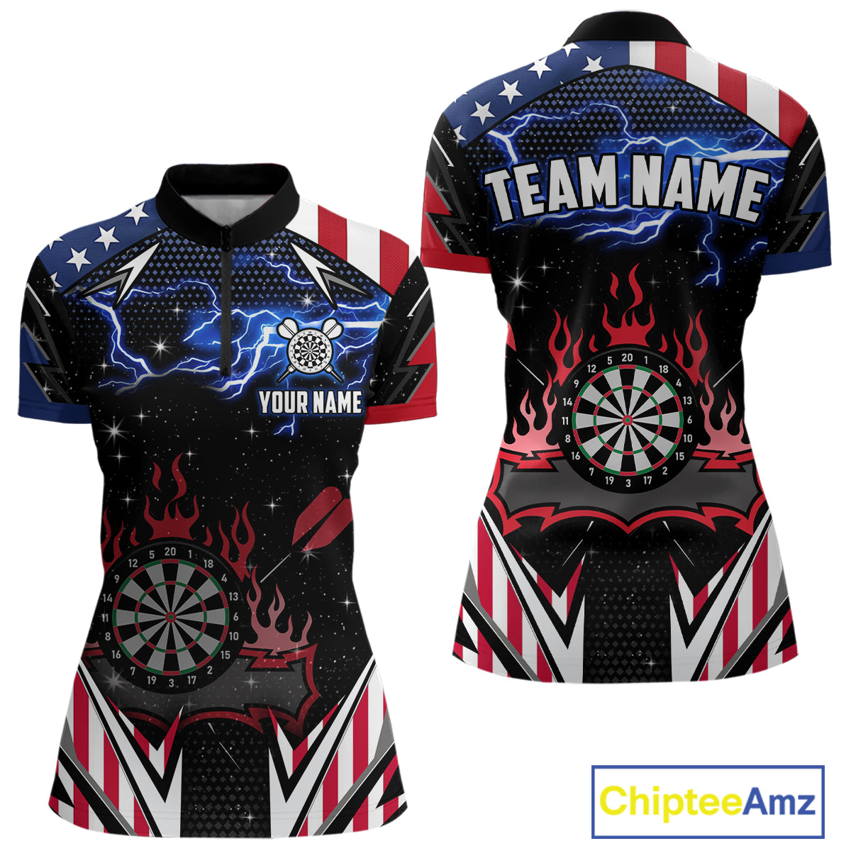 Personalized Thunder Lightning American Flag Darts Shirt For Women, Patriotic Darts League Jersey TDM4504