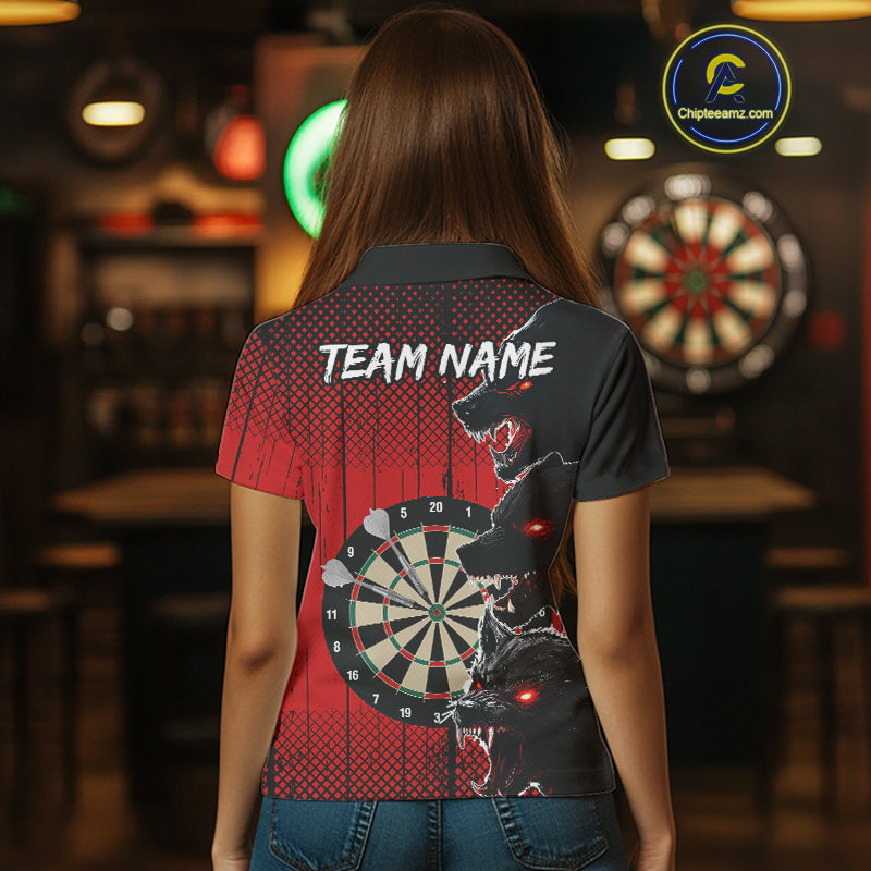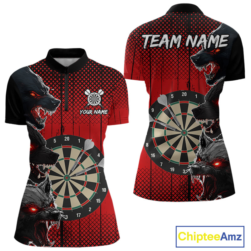 Personalized Red Grunge Wolf Darts Shirt For Women Custom Funny Darts Jersey Team Polo & 1/4 Zip TDM4672