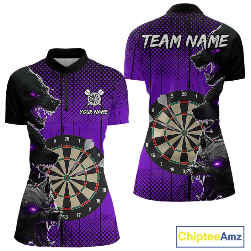Personalized Purple Grunge Wolf Darts Shirt For Women Custom Funny Darts Jersey Team Polo & 1/4 Zip TDM4673