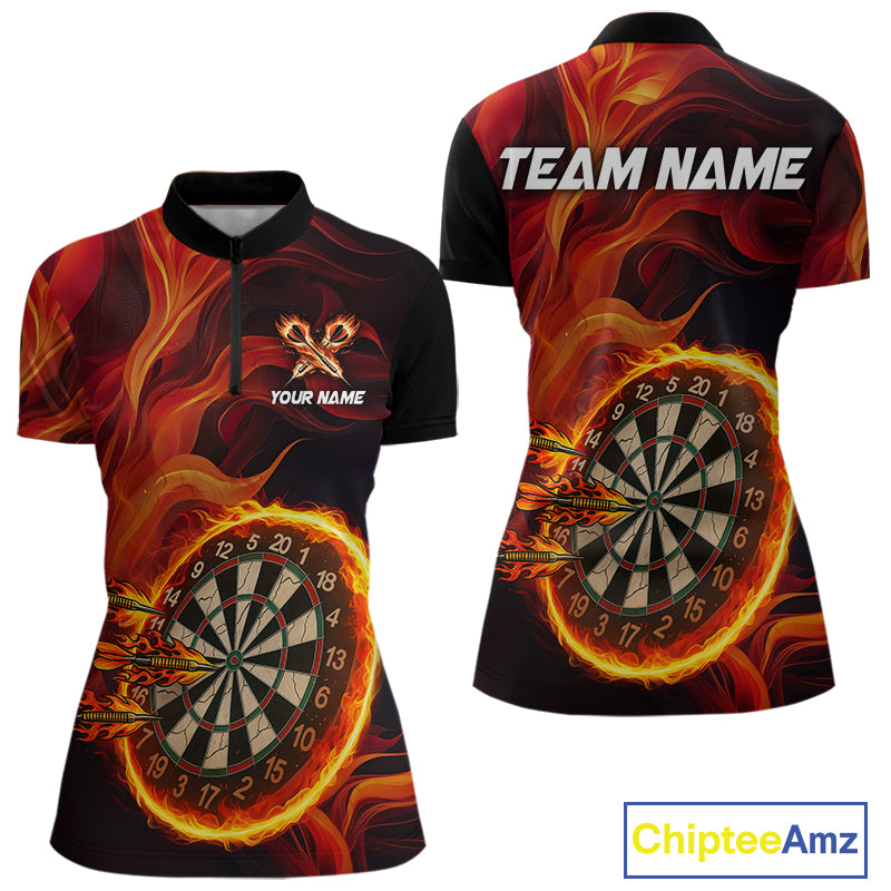 Red Flaming Dartboard Shirt For Women Custom Fire Darts Jersey Polo & Quarter Zip Team Uniform TDM4675