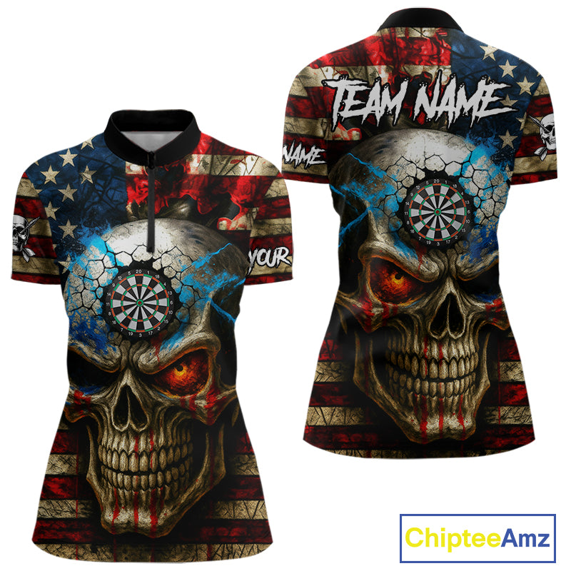 Personalized Vintage American Flag Skull Darts Shirt For Women, Patriotic Darts League Team Jersey TDM4708