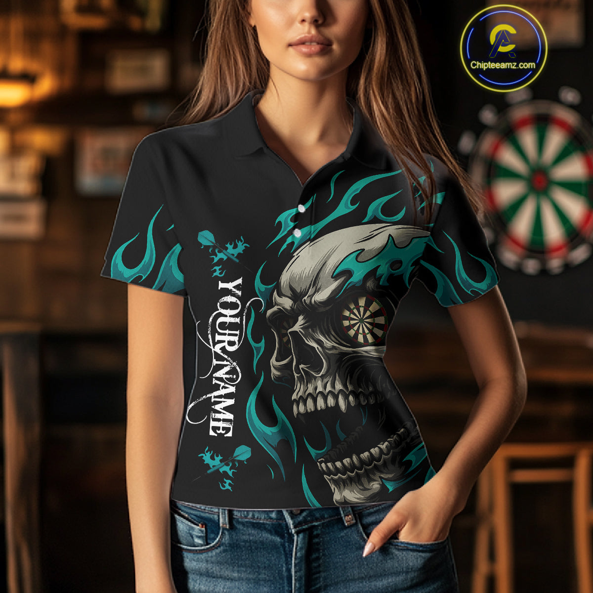 Personalized Turquoise Flaming Skull Darts Shirt For Women Custom Darts Jersey Team Polo & 1/4 Zip TDM4763