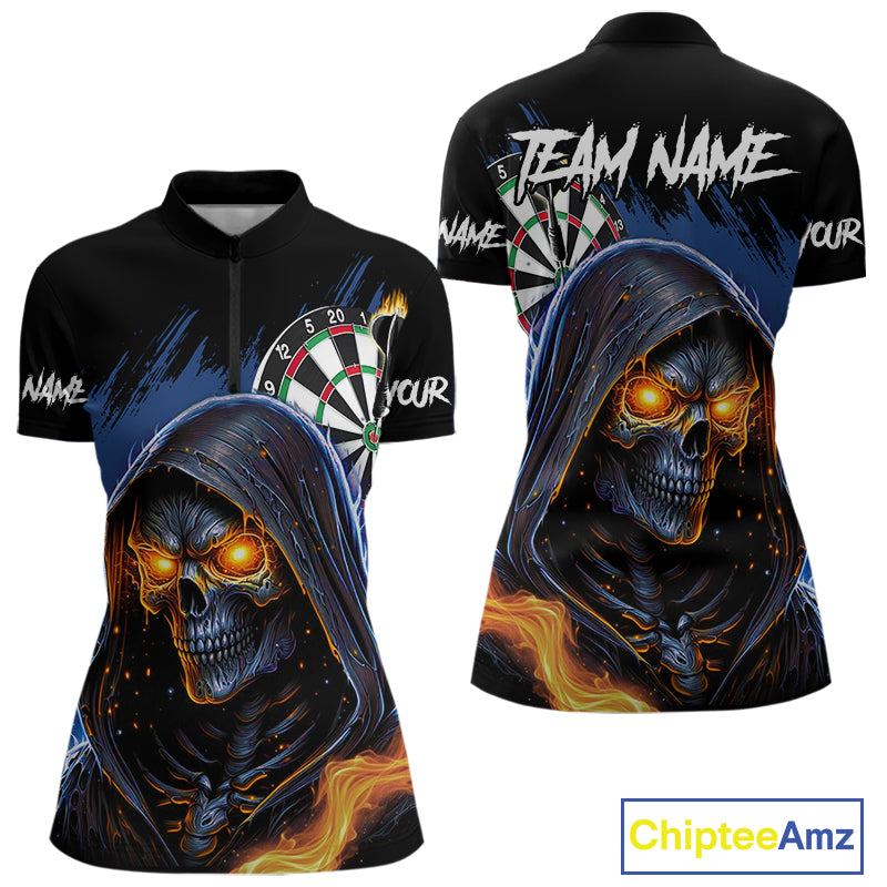 Personalized Blue Death Skeleton Fire Dart Shirts For Women Custom Skull Dart Jersey Polo & 1/4 Zip TDM4892