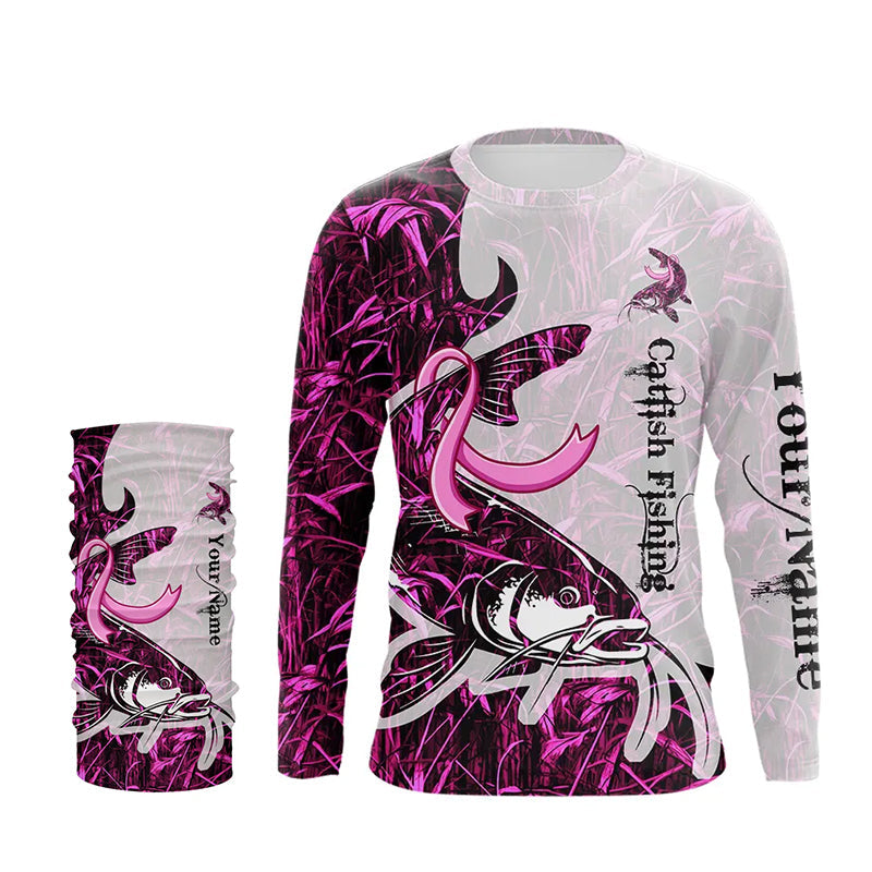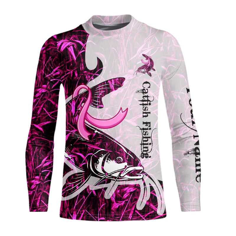 Catfish fishing pink Camo ribbon Breast Cancer Custom name sun protection long sleeves fishing shirts NQS9760