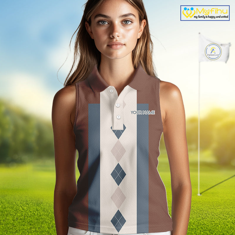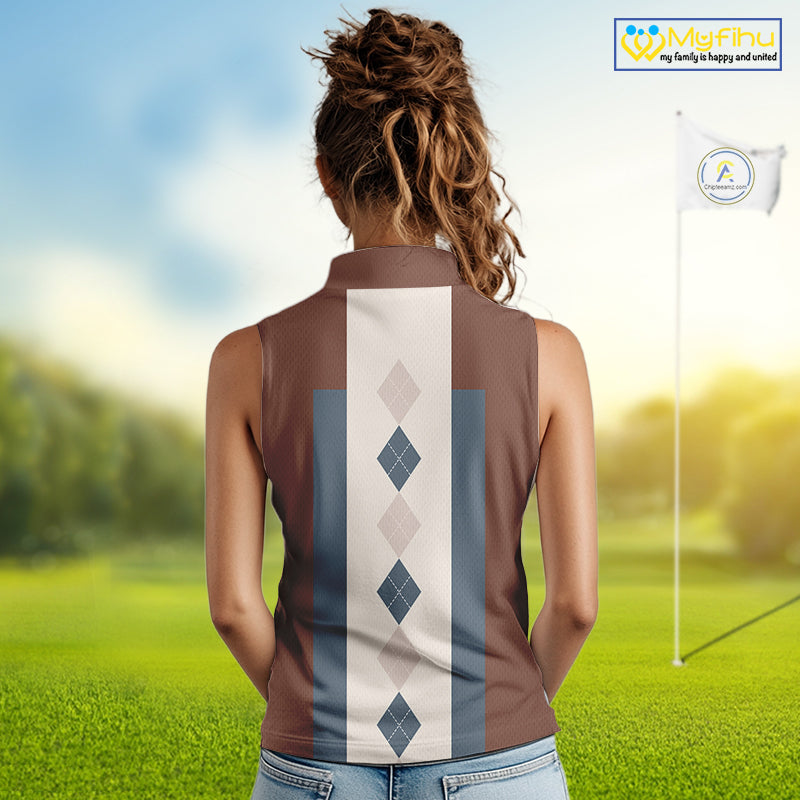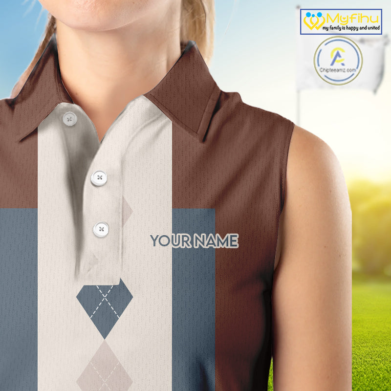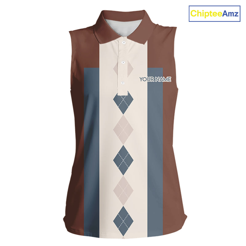Brown Argyle Pattern Women Sleeveless Polo Shirt Custom Vintage Style For Golf Lovers Gift For Ladies NQS10233
