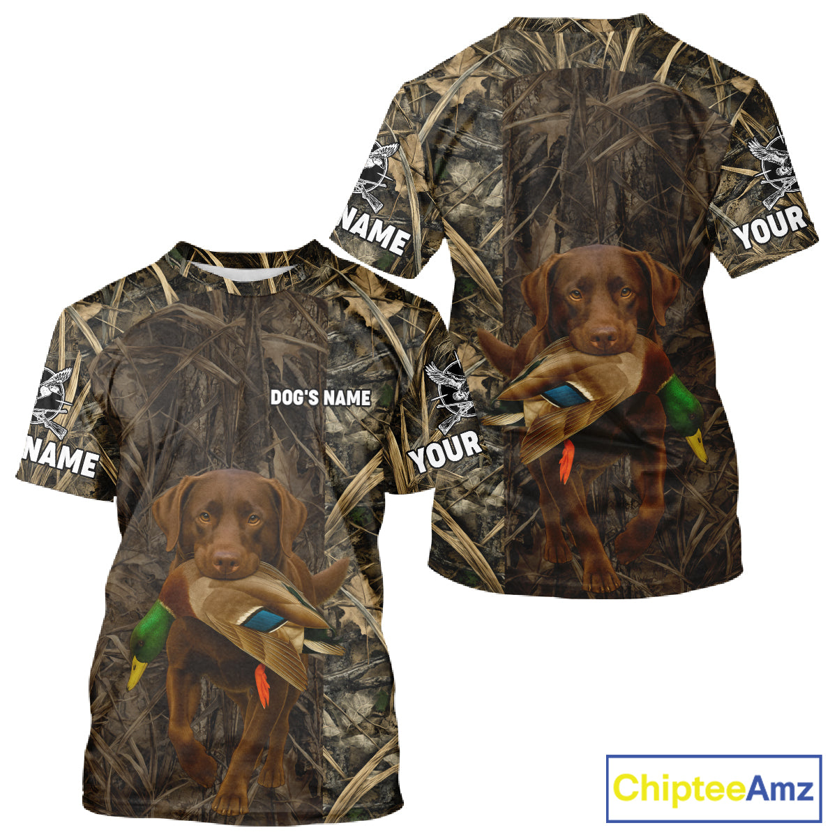 Personalized Mallard Duck Hunting Shirt with Chocolate Lab, Custom Dog’s Name Camouflage NHT264