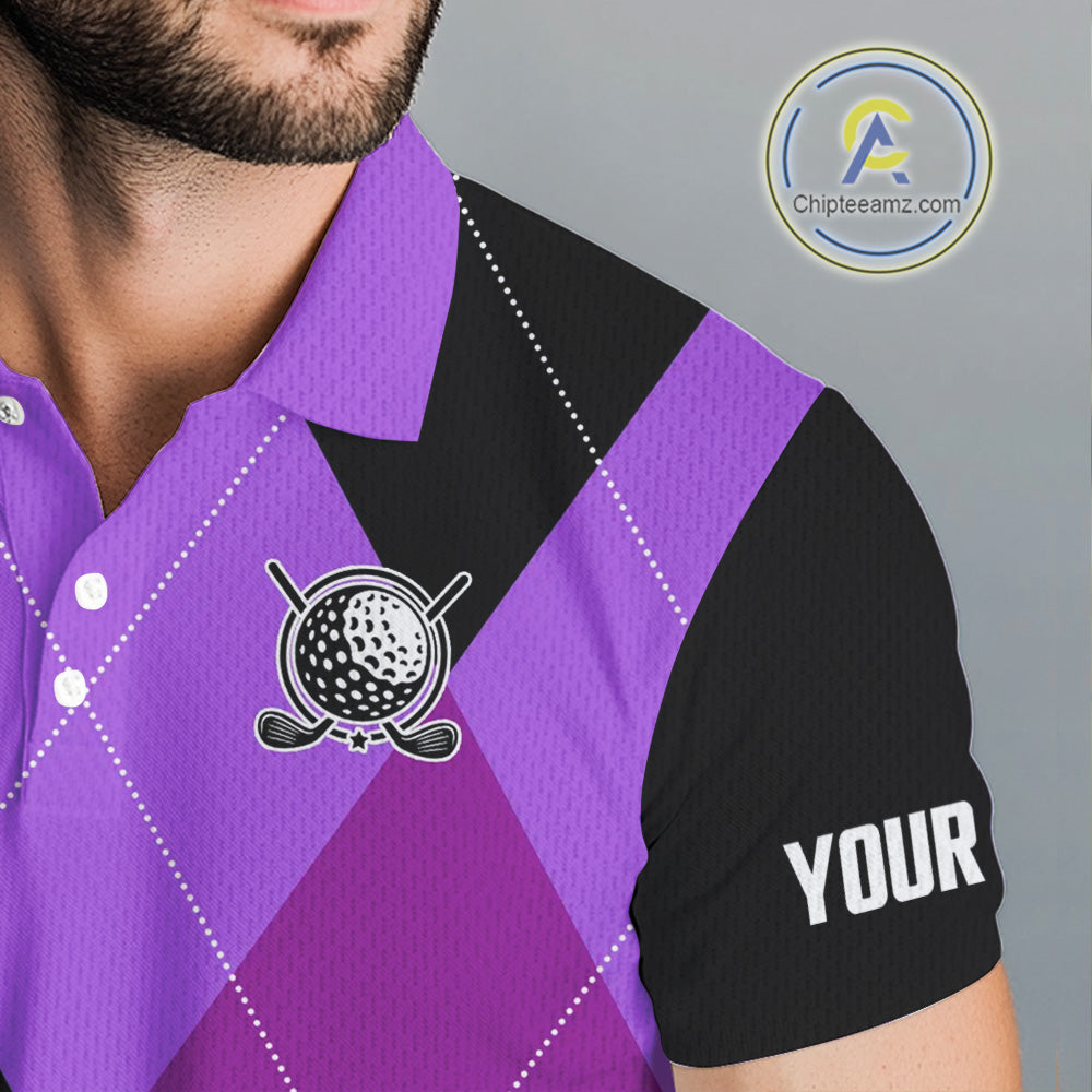 Mens golf polos shirts custom purple and black golf argyle plaid pattern, personalized golf gifts NQS10653