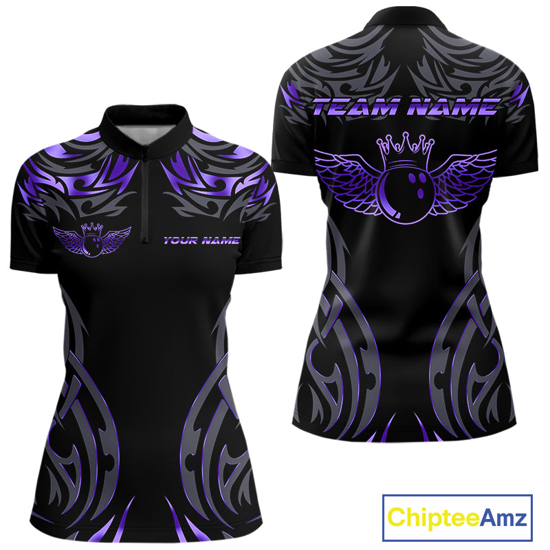 Personalized Black And Purple tribal pattern Bowling Shirt For Women, angel wings Bowling Team jersey NQS10760
